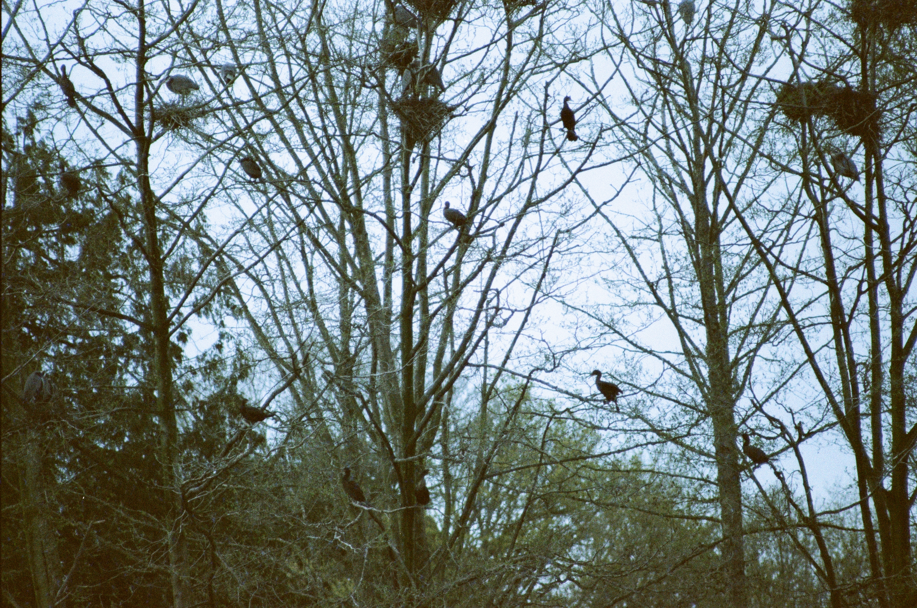 cormorants in trees - minolta x-700, minolta MD 300 mm f4.5 lens, wolfen NC 400 film